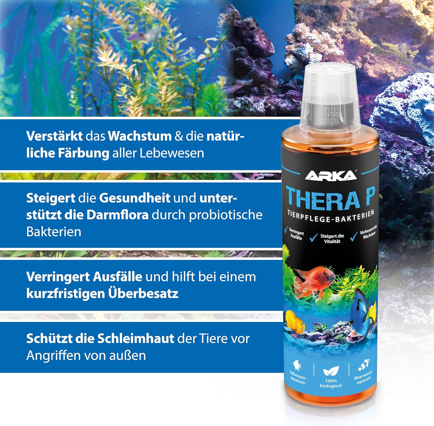 Ecological Labs TheraP is a high-quality fish care treatment designed for both freshwater and saltwater aquariums and tanks. Beneficial effects include increased fish size, growth, and strength, as well as reduction of stress symptoms such as pacing, and reduction of issues such as fin loss. Fish immune system is boosted, and ammonia and nitrite concentrations are reduced.